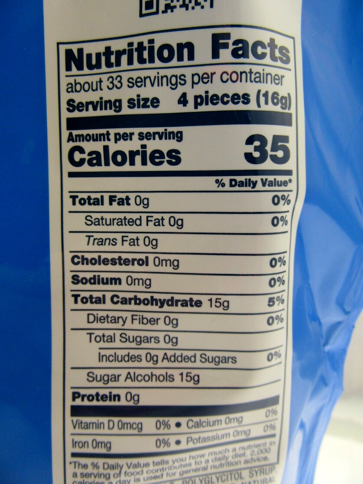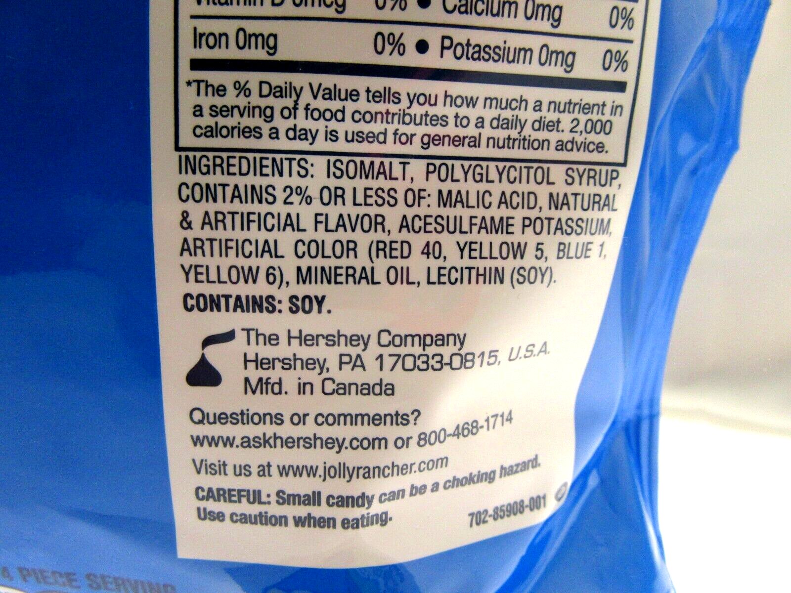 10 calories per piece Ingredients: Isomalt; Polyglucitol Syrup; Contains 2% Or Less Of: Malic Acid; Natural And Artificial Flavor; Acesulfame Potassium; Artificial Color (Red 40; Blue 1; Yellow 5; Yellow 6). Allergy Information: Manufactured On The Same Equipment That Processes Milk. Individuals Sensitive To Sugar Substitutes May Experience A Laxative Effect.