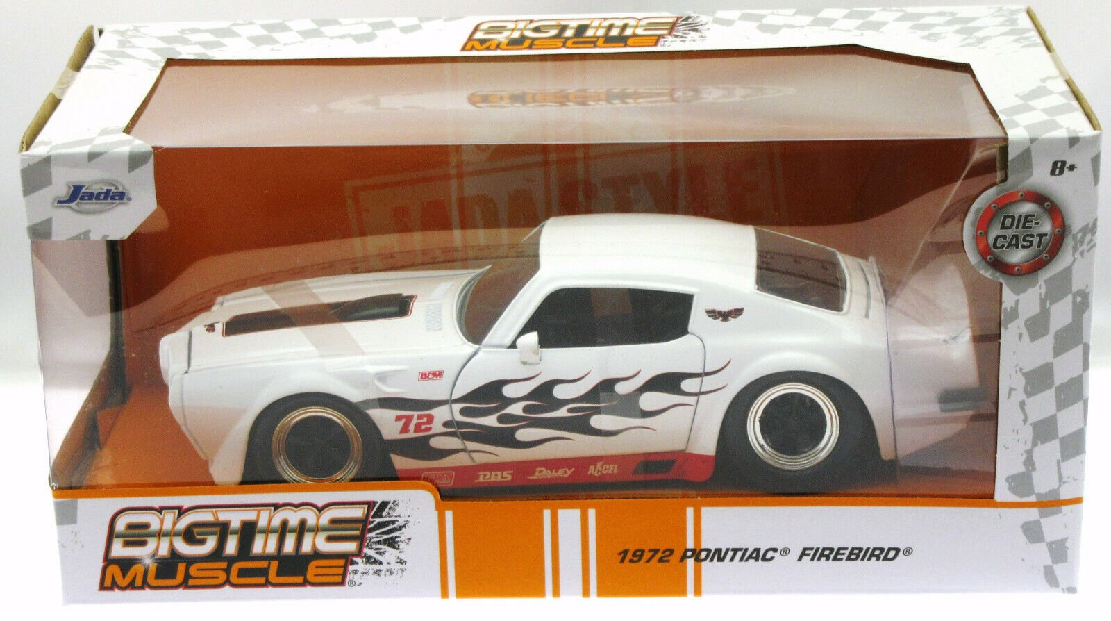 This 1972 Pontiac Firebird diecast car is a perfect addition to any car collection. With a 1:24 scale, it's a great way to show off your love for American muscle cars. The car comes in an unopened box and is recommended for kids aged 8 and above. The model is part of the Bigtime Muscle series and features a white Firebird with a metal body. The car is perfect for both boys and girls and is a great way to encourage their love for cars. The model is not modified and was manufactured in 2021 by Jada. This diecast car is a must-have for any car enthusiast and is a great way to display your collection.