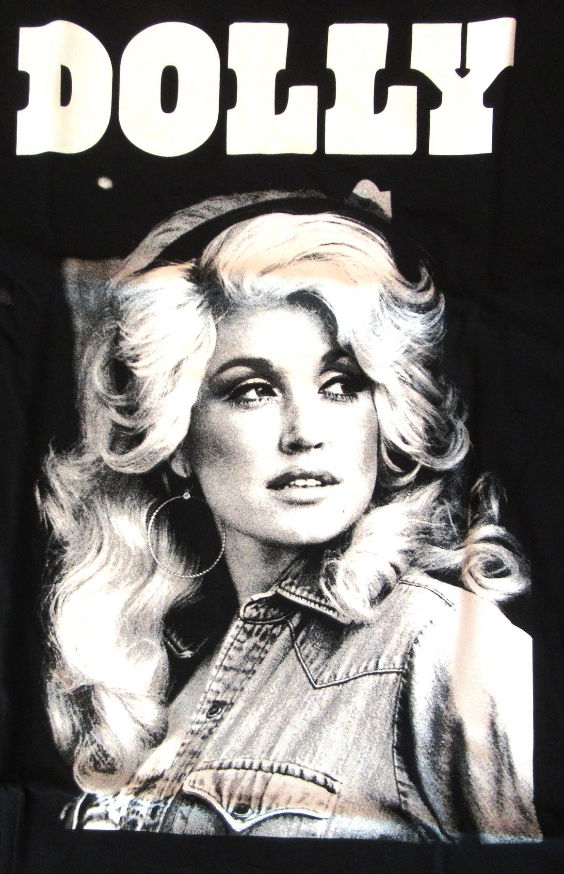 This Dolly Parton T-shirt is a must-have for any fan of the country music legend. Featuring a bold graphic print of Dolly's name and a round neckline, this shirt is made of 100% cotton Algodon fabric that is both comfortable and machine washable. The short-sleeved shirt is designed with a regular fit and is available in size Extra Large (46-48). The black T-shirt is perfect for any casual occasion and is sure to turn heads with its unique design and high-quality fabric. Whether you're attending a concert or just running errands, this Dolly Parton T-shirt is a great addition to your wardrobe.