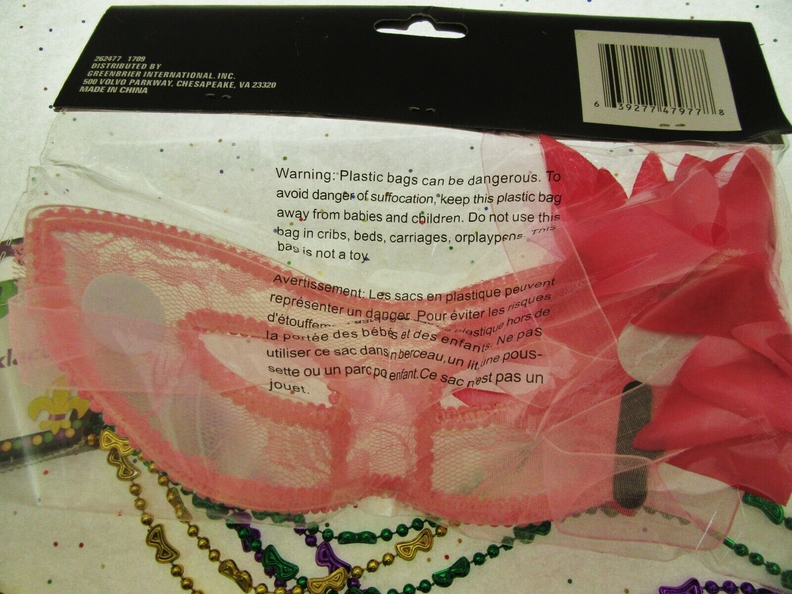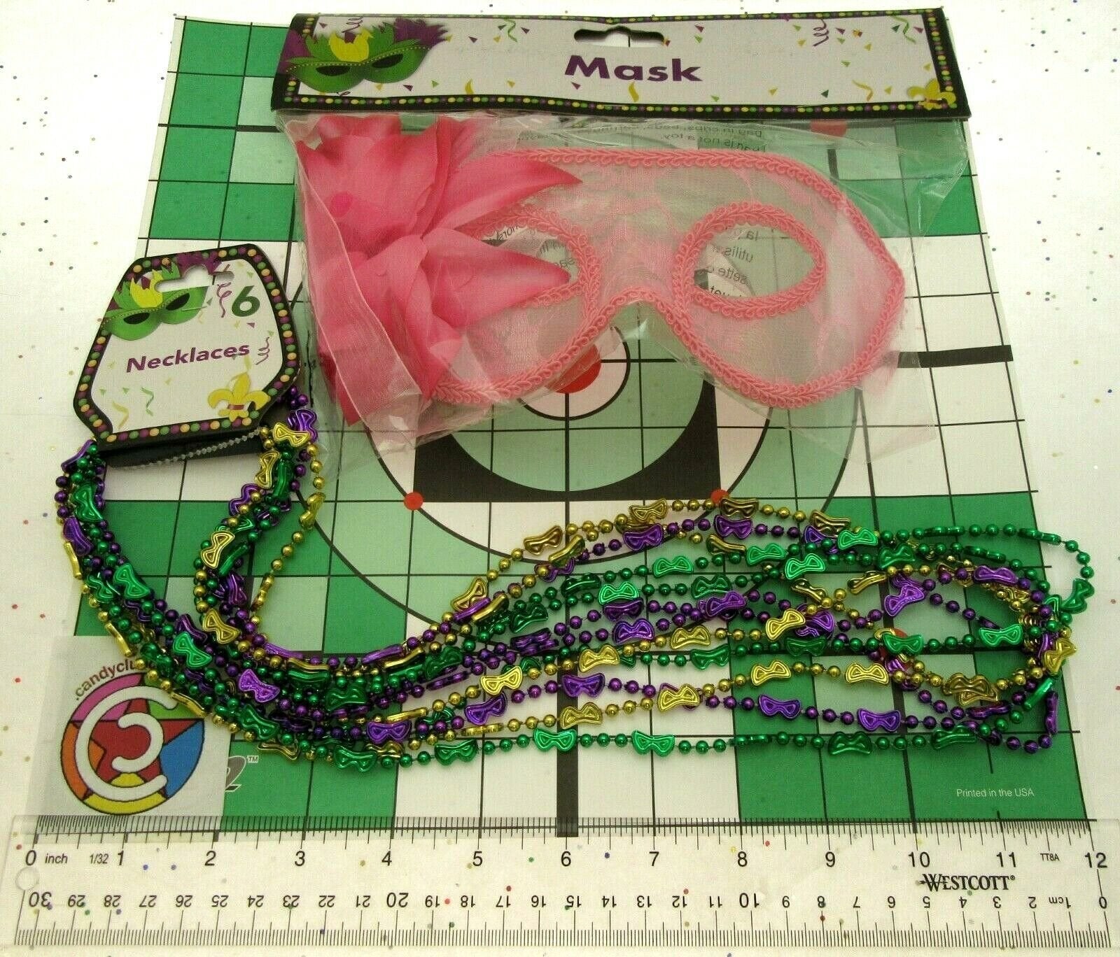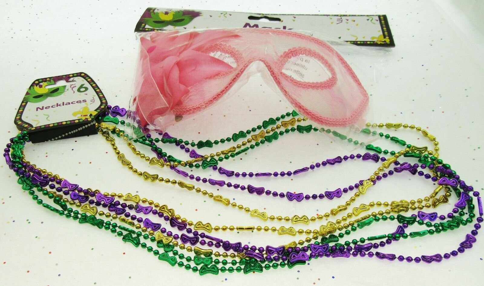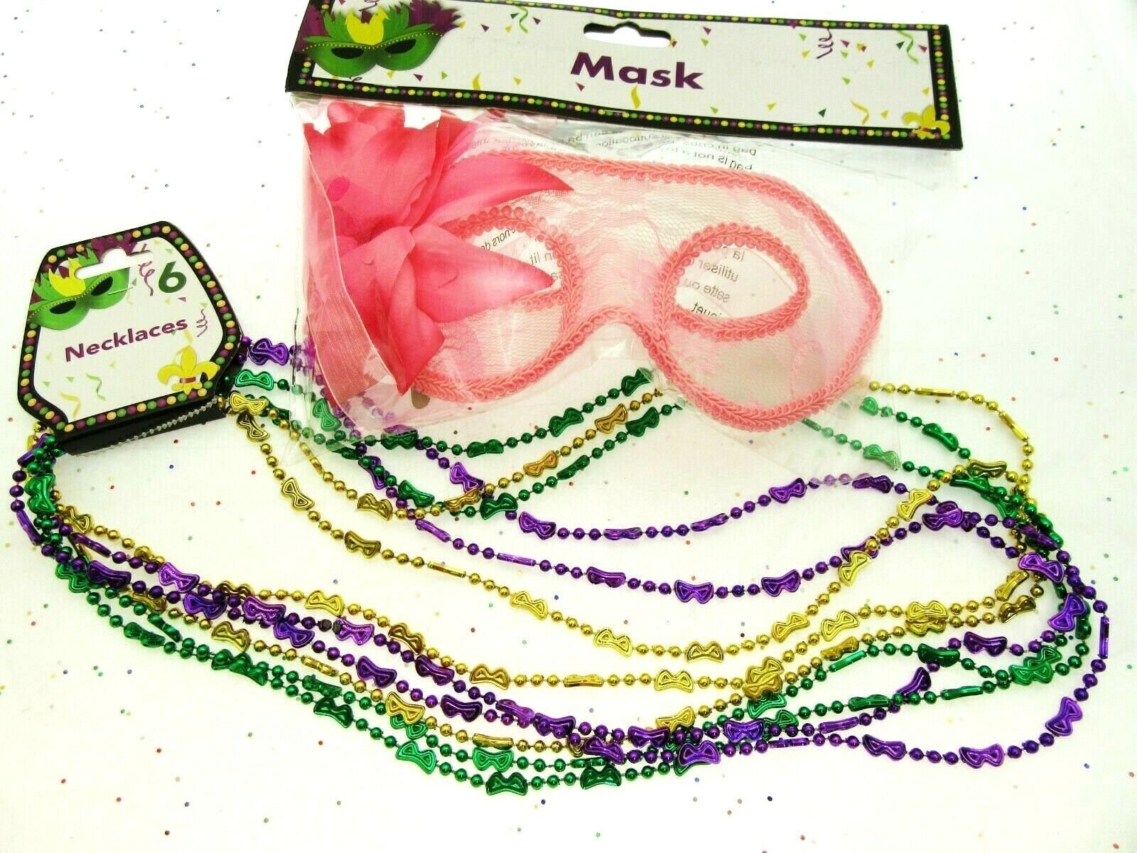 Mardi Gras Eye Mask & Necklaces Costume Mascaraed Parade New Orleans Party pink