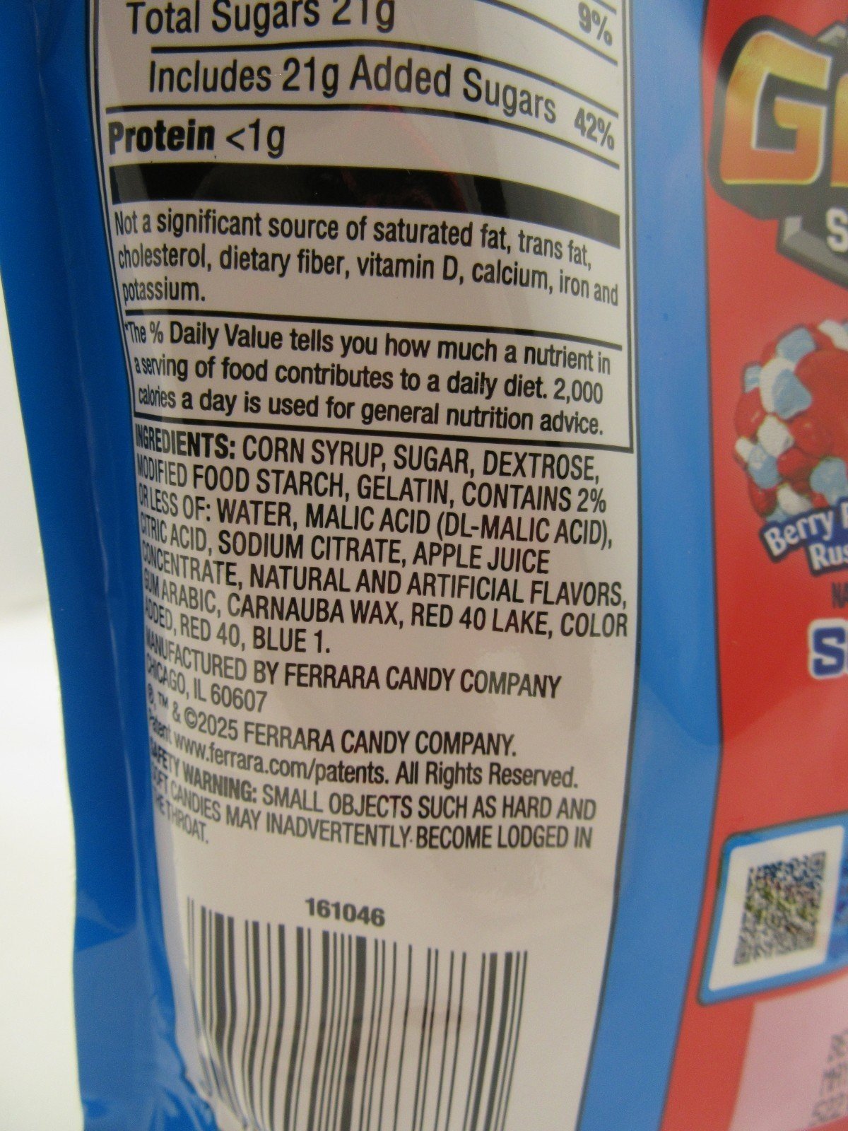 The Nerds Berry Punch Rush Juicy Gummy Clusters are a delicious and fun treat perfect for a party or any occasion. These gluten-free gummy clusters come in a 7.15oz bag and are made in the United States. Each serving size of 40 grams contains 100 calories, making them a sweet and satisfying snack.