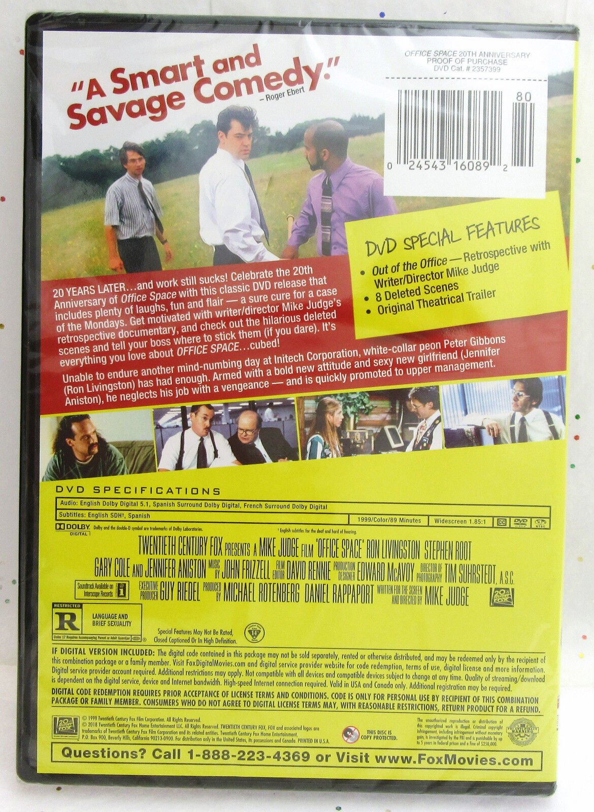Get ready to laugh with this classic comedy movie, "Office Space" directed by Mike Judge. Starring Ron Livingston and Stephen Root, this DVD edition is the perfect addition to your collection. The 20th Anniversary edition is rated R and has a run time of 89 minutes. This DVD is formatted for Region Code 1 (US, Canada...) and was released in 1999 by 20th Century Studios. The movie is a comedy-contemporary genre and features a generic brand. The modified item is no and the studio is 20th Century Studios. With a sub-genre of comedy, this DVD edition is a must-have for any movie lover.