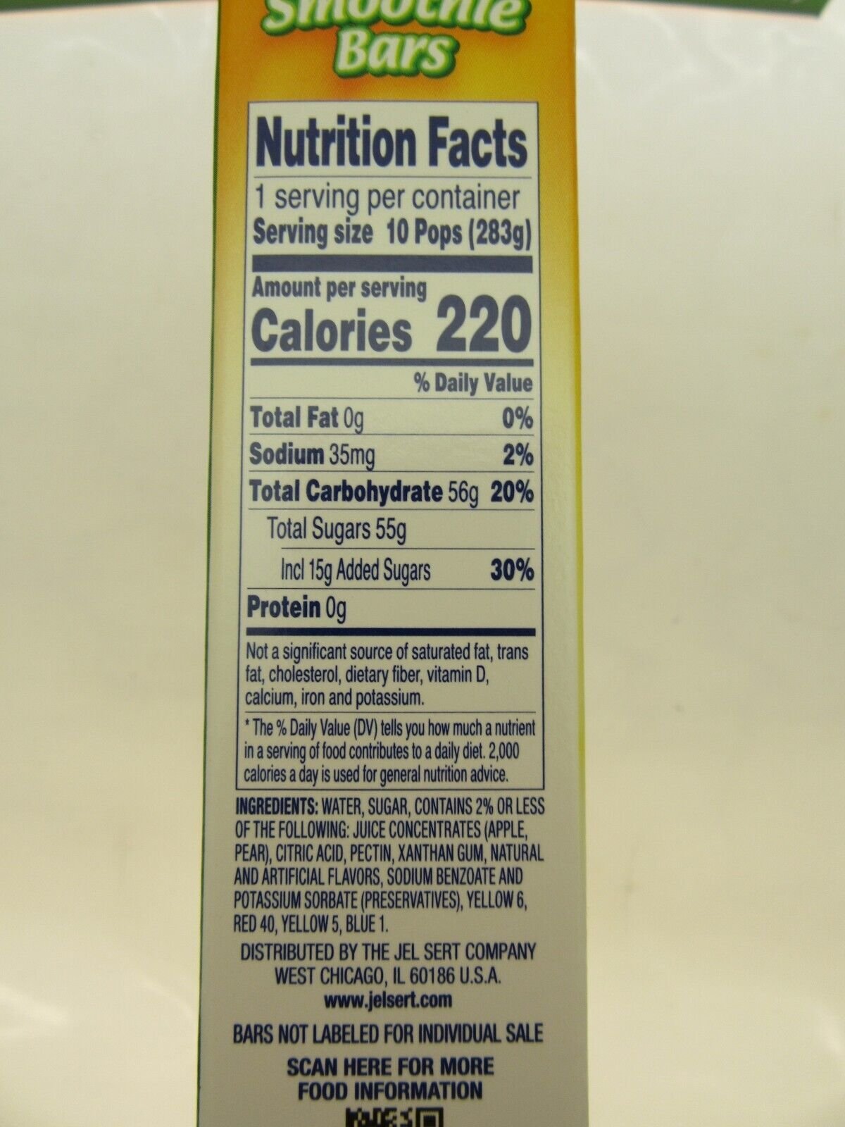 Enjoy the delicious taste of Sunkist Smoothie Freezer Pops, now available in a box of 10 bars. These slush bars are perfect for a quick and tasty dessert snack, and each bar contains only 270 calories. Made in the United States with high-quality ingredients, these pops are sure to satisfy your sweet tooth cravings. The Sunkist brand is known for its refreshing and tasty products, and these freeze pops are no exception. Each bar is individually wrapped, making them perfect for sharing or for taking on-the-go. Whether you're looking for a tasty treat or a fun snack, these Sunkist Smoothie Freezer Pops are the perfect choice.