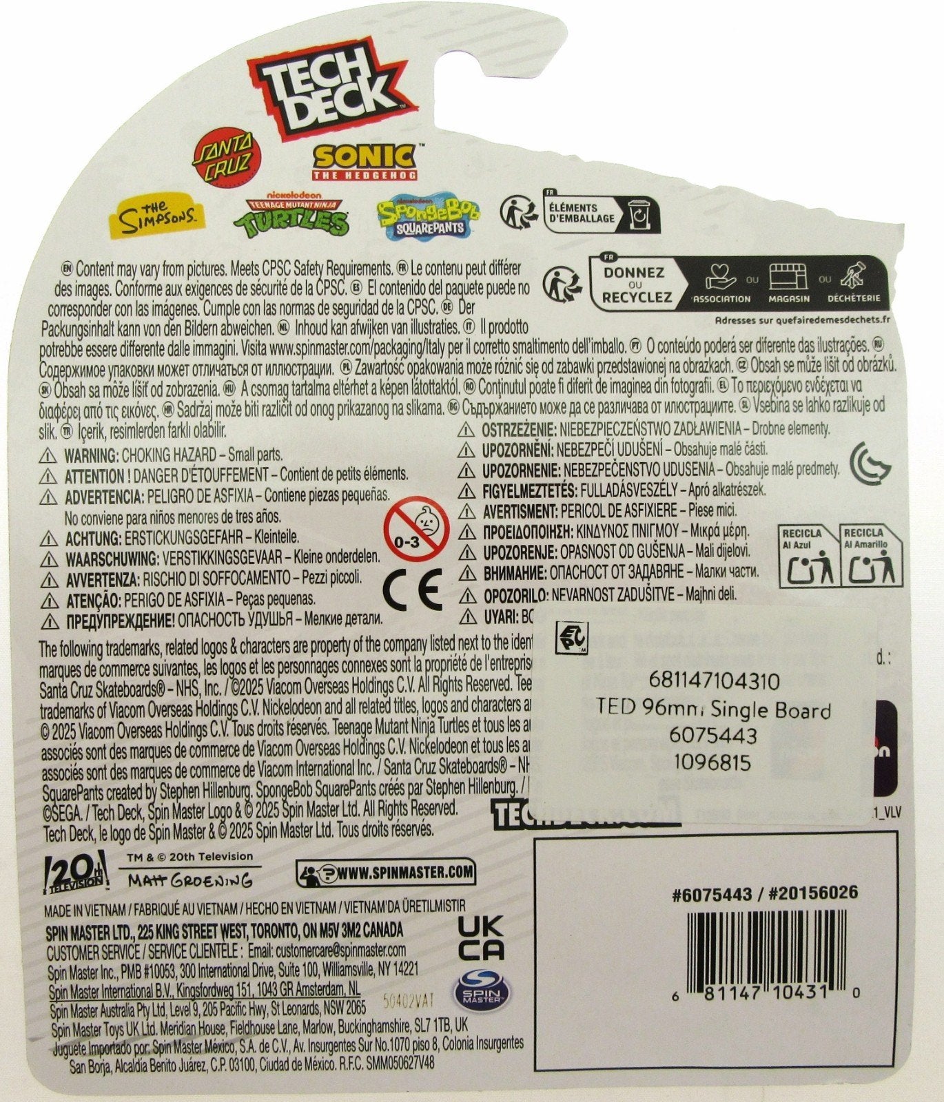 The Tech Deck Santa Cruz Skateboard/fingerboard featuring Homer Simpson is a unique toy inspired by the popular TV show "The Simpsons." This multicolored fingerboard is part of the "Tech Deck" brand and is manufactured in the year 2025, making it a collectible item for fans of both skateboarding and the iconic TV show. With its detailed design and ties to the beloved animated series, this product is sure to appeal to both fans of "The Simpsons" and enthusiasts of skateboarding.