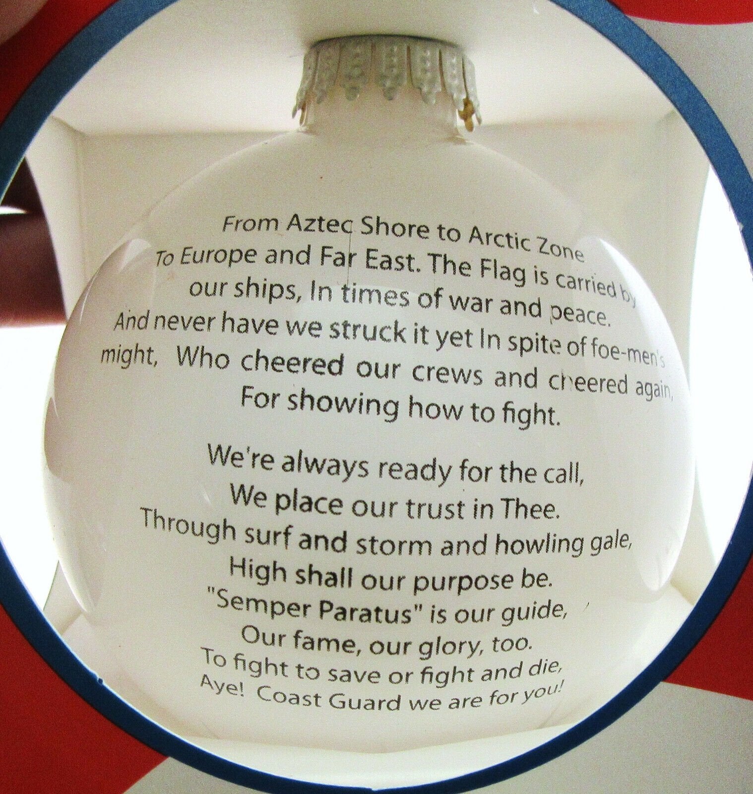 Christmas Tree Ornament~ United States Coast Guard ~From Aztec shore to Arctic zone, To Europe and Far East. The Flag is carried by our ships in times of war and peace.And never have we struck it yet in spite of foe-men's might, Who cheered our crews and cheered again, For showing how to fight.We're always ready for the call, We place our trust in Thee.Through surf and storm and howling gale, High shall our purpose be."Semper Paratus" is our guide, Our fame, our glory, too.to fight to save or fight and die,Aye! Coast Gaurd we are for you!